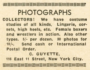 Charles Guyette had a business in New York City selling theatrical costumes. For a time he sold photographs showing models in high heel shoes which served as a catalog for the footwear he was offering. He also sold other types of photographs which aren’t shown in the ebook: boots, corsets, other types of fetish clothing, and bondage (advertisement is from August 10, 1935 issue of London Life).
